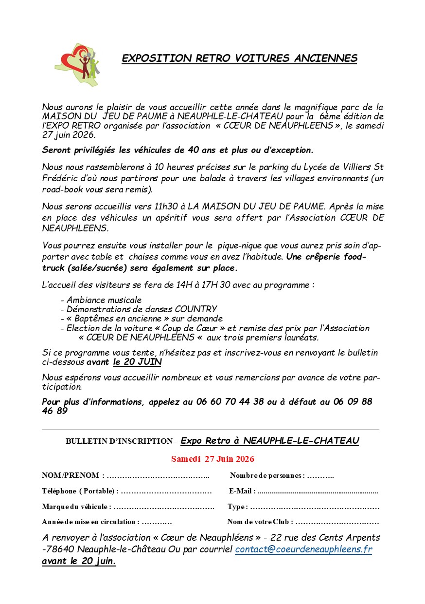 L’Association « CŒUR DE NEAUPHLEENS organise pour la 5ème année une exposition de voitures anciennes. Cet évènement se déroulera le samedi 14 juin au Foyer Rural de Jouars-Pontchartrain (place du 8 mai) de 14H à 17H30